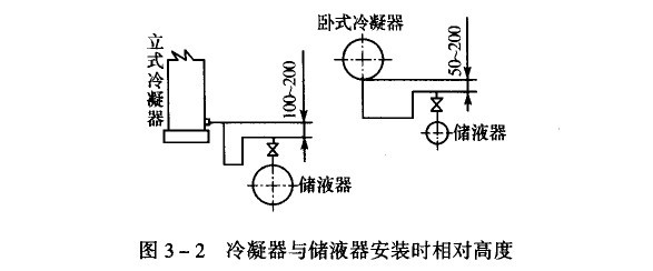 冷凝器和儲液器安裝時的相對高度,如圖3-2所示。其相對高度應(yīng)予保證,使冷凝后的制冷劑液體靠重力流人儲液器的可能性。