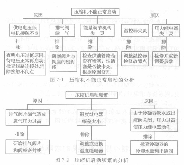 壓縮機(jī)不能正常啟動(dòng)的原因分析及排除方法見(jiàn)圖7-1。
