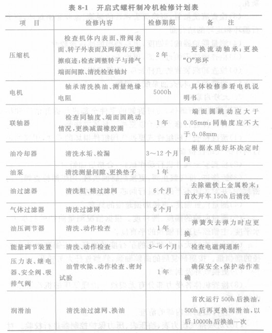 螺桿式制冷機(jī)的計(jì)劃檢修見表8-1。
