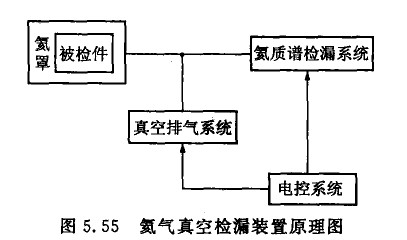 1)真空氨氣檢漏。該方法的檢漏原理如圖5.55所示,將待檢電冰箱、空詞器或部件內(nèi)部抽成真空,然后與氨質(zhì)譜儀相連接,并將被檢整機或部件外部用充滿氦氣的罩子罩住。如果被檢測處有泄漏,氮氣則通過泄漏處進入被檢測件內(nèi)部,經(jīng)真空管道吸人氦質(zhì)譜檢漏儀來測定其漏率。該方法能確定整體綜合漏率,不易出現(xiàn)誤檢、漏檢,但存在氦氣不能回收利用、對不合格產(chǎn)品無法指導返修的缺點。如用噴氮法則可以確定漏點(小區(qū)域)以指導返修。