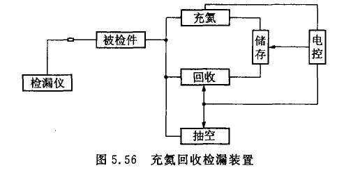 2)充氯吸槍法檢漏。該方法的檢漏原理如圖5.56所示,將待檢電冰箱、空調(diào)器或部件的內(nèi)部充人一定壓力的氦氣,在被檢件的外部用吸槍將工件內(nèi)泄漏出的氮氣吸人到氮質(zhì)譜檢漏儀來測定其漏率。此方法適用于生產(chǎn)過程中確定整機或部件的漏孔的多少,漏孔的具體位置和漏率的大小,可指導返修。這種檢漏方法的氨氣可以回收。生產(chǎn)廠家多采用此種方法檢漏。