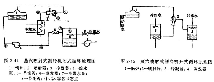 上述系統(tǒng)中制冷劑實(shí)現(xiàn)了閉式循環(huán)。但在實(shí)際應(yīng)用中,常常用開(kāi)式循環(huán),如圖2-45所示。在這種循環(huán)中,冷凝后的水不再補(bǔ)給到鍋爐里,鍋爐用另外水補(bǔ)給。兩種循環(huán)的制冷原理是一樣的。