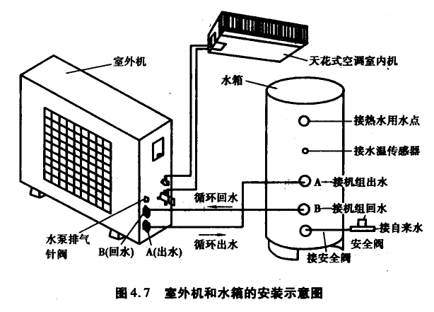 2)水箱靠近室外機(jī)安裝;距離小于5 m,以免水管太長導(dǎo)致水阻增加,造成流量變小。