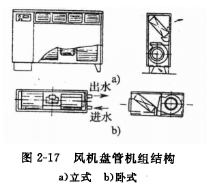 風機盤管由盤管、風機(前向多翼離心風機或貫濾風機)、電動機、空氣過濾器、凝水盤及箱體組成,還配有室溫自動調節(jié)裝置,機組有立式、臥式、立柱式和頂棚式四種。它又有明裝與暗裝,與風機盤管相接的有冷、熱水管路和凝水管路,其結構如圖2-17所示。