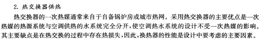 熱交換器的一次熱媒通常來自于自備鍋爐房或城市熱網(wǎng)。采用熱交換器的主要優(yōu)點是一次熱媒的熱源系統(tǒng)與空調(diào)供熱的水系統(tǒng)完全分開,使空調(diào)熱水系統(tǒng)的設(shè)計不受一次熱媒的影響。其主要缺點是在熱交換的過程中存在熱損失,因此,換熱器的性能是設(shè)計中要考慮的主要因素。