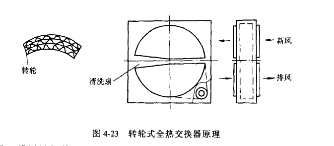 圖4-23示出轉(zhuǎn)輪式全熱交換器原理。轉(zhuǎn)輪是用噴涂氯化鋰的鋁箔及非金屬膜、特殊紙等材質(zhì)做成蜂窩狀,外形成輪形并轉(zhuǎn)動。輪子上半部通過新風(fēng)、下半部通過室內(nèi)排風(fēng)。如在冬季,排風(fēng)的溫濕度高于新風(fēng),排風(fēng)經(jīng)過轉(zhuǎn)輪時,使輪心材質(zhì)的溫度升高,水分含量增多。當(dāng)輪心材質(zhì)經(jīng)過清洗扇轉(zhuǎn)至與新風(fēng)接觸時,輪心便向新風(fēng)放出熱量和水分,使新風(fēng)升溫增濕;而在夏季,輪心的工作與之相反,減低新風(fēng)的溫、濕度,提高排風(fēng)的溫、濕度。