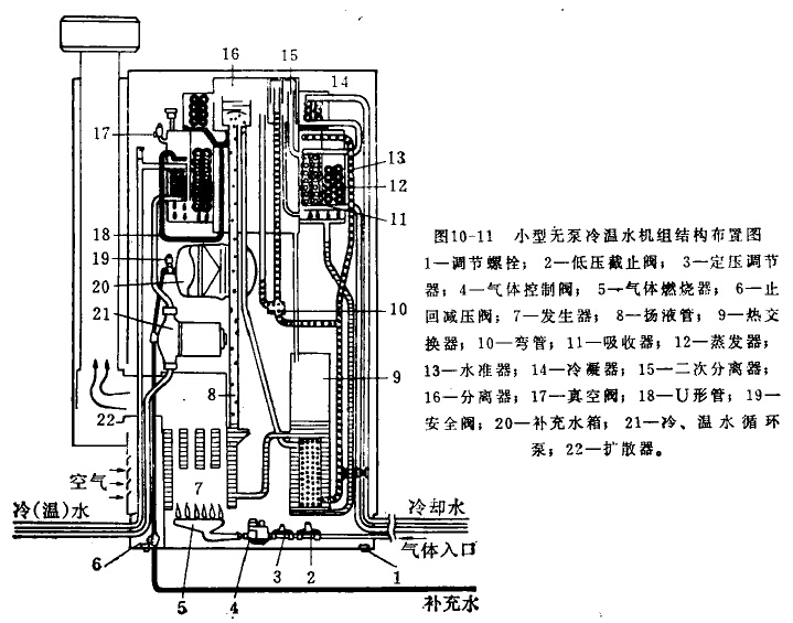 無電動循環(huán)泵的冷溫水機組一般為小能量機組,有制取冷、熱風(fēng)的風(fēng)冷式和制取冷、溫水的水冷式兩種結(jié)構(gòu)。這種制冷機的特點如下: