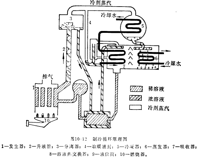 (1)通過油或燃氣的燃燒,加熱發(fā)生器中的稀溶液至沸騰狀態(tài),冷劑蒸汽從溴化鋰溶液中分離而出,兩者成泡沫狀通過揚液管上升至分離器??梢岳斫猓撋仙Υ媪搜h(huán)泵而成為溶液循環(huán)的原動力,因而,揚液作用構(gòu)成了這種機器區(qū)別于前述吸收式制冷機的主要之點。