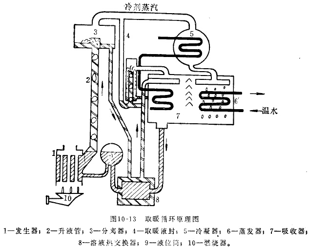 只要截斷吸收器與冷凝器中流動的冷卻介質(zhì),即可進行取暖循環(huán)并制取熱量。吸收器與冷凝器中的冷卻介質(zhì)被截斷后,玲凝器的冷凝壓力升高,U形彎管穿通。由分離器來的高溫冷劑蒸汽通過U形彎管直接進入吸收一蒸發(fā)器中,用來加熱蒸發(fā)器中的冷卻介質(zhì)(溫水或風(fēng))。此時,蒸發(fā)器起冷凝器的作用。冷劑蒸汽放出熱量后凝結(jié)成水,由蒸發(fā)器流至吸收器,并在吸收器中與由熱交換器來的濃溶液相混合而成稀溶液。稀溶液再利用其位差通過熱交換器流至發(fā)生器,完成循環(huán)過程。