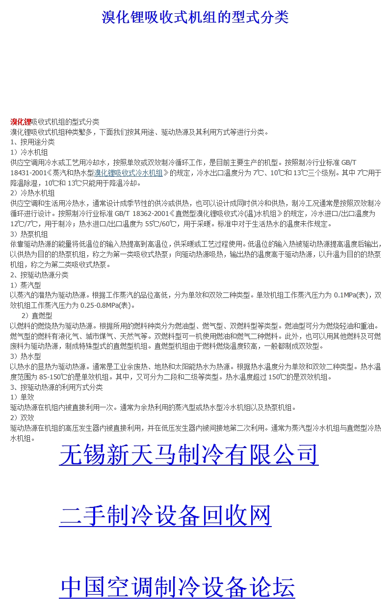 溴化鋰吸收式機(jī)組種類繁多,下面我們按其用途、驅(qū)動熱源及其利用方式等進(jìn)行分類。