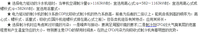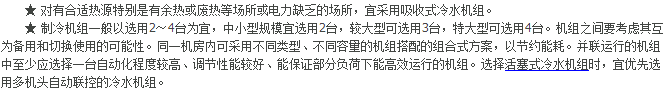 ★ 對大型集中空調(diào)系統(tǒng)的冷源,宜選用結(jié)構(gòu)緊湊、占地面積小及壓縮機、電動機、冷凝器、蒸發(fā)器和自控組件等都組裝在同一框架上的冷水機組。對小型全空氣調(diào)節(jié)系統(tǒng),宜采用直接蒸發(fā)式壓縮冷凝機組。 |