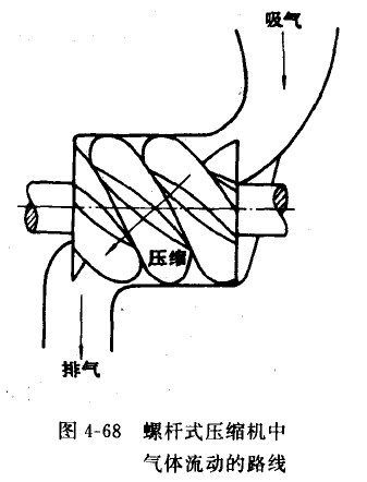 制冷劑蒸氣在螺桿式壓縮機中吸入和排出是在轉(zhuǎn)子的兩端進行的。一般吸氣過程是在轉(zhuǎn)子的上半部分進行,壓縮和排氣是在轉(zhuǎn)子的下半部分進行,制冷劑蒸氣在壓縮機中內(nèi)流動路線如圖4-68所示。