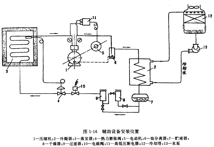 在壓縮式制冷系統(tǒng)中,除了必須的壓縮機(jī)、冷凝器、蒸發(fā)器和節(jié)流閥以外,還有許多改善制冷系數(shù)和保證運(yùn)轉(zhuǎn)安全不可缺少的輔助設(shè)備。屬于這類設(shè)備的主要有:油分離器、貯液器、過(guò)濾器、干燥器和冷卻塔。這些輔助設(shè)備在制冷系統(tǒng)中的相對(duì)位置如圖5-16所示。下面把這些輔助設(shè)備的功用、構(gòu)造和工作原理作些簡(jiǎn)單的介紹。