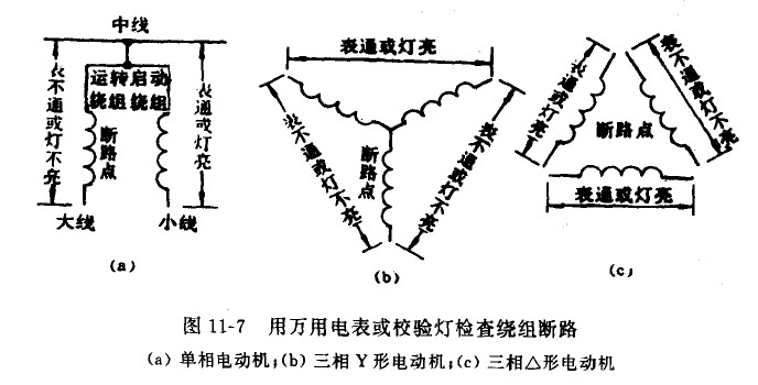檢查單相或三相電動機斷路時,可用兆歐表或用萬用電表(放在低電阻檔)、校驗燈來校驗(見圖11-7)。對于星形接法的電動機,檢查時需每相分別測試I對于三角形接法的電動機,檢查時必須把三相繞組的接線頭拆開后,再每相分別測試。測試時,哪一相表不通或燈不亮即為這相斷路。泵殼內(nèi)斷路需剖開泵殼檢修。