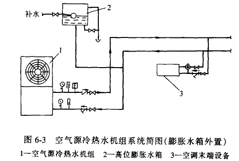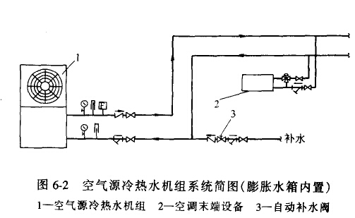 用于家用中央空調(diào)系統(tǒng)的空氣源冷熱水機(jī)組,室外主機(jī)一般由壓縮機(jī)、冷凝器、蒸發(fā)器、循環(huán)水泵組成。壓縮機(jī)分為定速和變速兩種。對(duì)于定速冷熱水機(jī)組,室內(nèi)負(fù)荷變化容易造成壓縮機(jī)頻繁起、停,因此系統(tǒng)中宜設(shè)蓄能水箱,或加大供、回水溫差的設(shè)定值。膨脹水箱分內(nèi)置和外置兩種,見圖6-2和圖6-3。系統(tǒng)補(bǔ)水方式與膨脹水箱的設(shè)置方式有關(guān)。對(duì)于冬季間歇運(yùn)行,并且室外氣溫較低而致使系統(tǒng)容易結(jié)冰的地區(qū),可以將蒸發(fā)器及循環(huán)水泵與室外主機(jī)分開而組成室內(nèi)輔機(jī)。室內(nèi)輔機(jī)與室外主機(jī)用制冷劑管連接。在寒冷地區(qū),冬季室外溫度較低,根據(jù)夏季冷負(fù)荷選用的冷熱水機(jī)組,冬季供熱量常常不能滿足冬季熱負(fù)荷的要求,此時(shí)應(yīng)考慮選用輔助電加熱來增加供熱量。