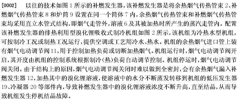 [0006] 本實用新型提出的補燃發(fā)生器帶有通風管,通風管上設(shè)有閥門或密封蓋板。配置該補燃發(fā)生器可消除或大幅度降低排熱利用型溴化鋰吸收式制冷機組的停機結(jié)晶風險,提高機組的安全性和可靠性。