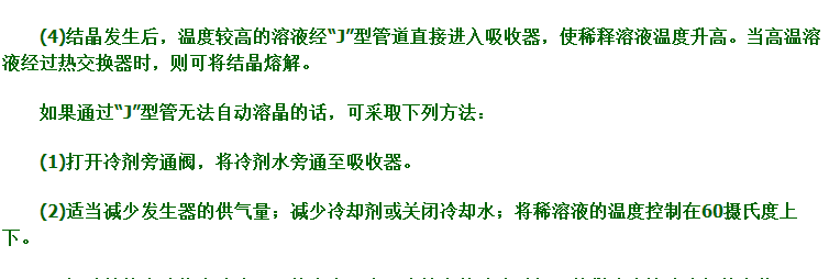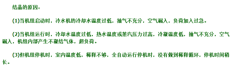 溴化鋰溶液結(jié)晶是冷水機(jī)常見(jiàn)的故障之一,“J”型管發(fā)燙是結(jié)晶的標(biāo)志,那么溴化鋰溶液結(jié)晶是什么原因呢?如果無(wú)法自動(dòng)溶晶的話(huà)可有什么辦法解決呢?下面由小編簡(jiǎn)單說(shuō)說(shuō)吧:
