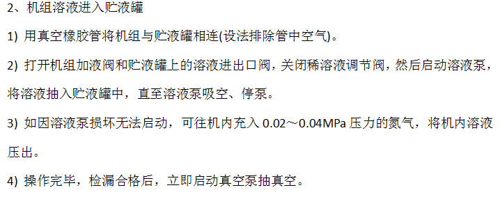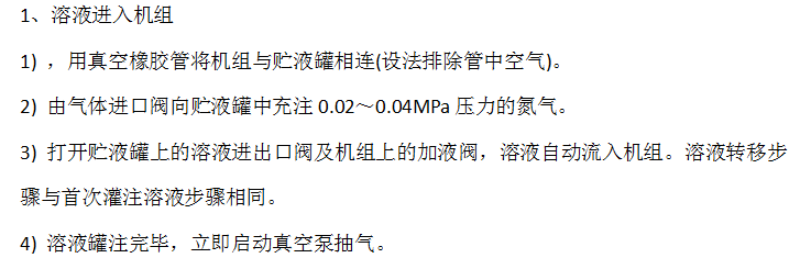 貯液罐的溶液轉(zhuǎn)移機組檢修時,如溶液需放出機組,應遵循下列原則:一是進入溶液的容器必須保持高度真空;二是在溶液轉(zhuǎn)移過程中用氣壓產(chǎn)生壓差時,應優(yōu)先在真空條件下充氮氣,如不得已進入空氣,須在溶液轉(zhuǎn)移完畢后立即抽真空。