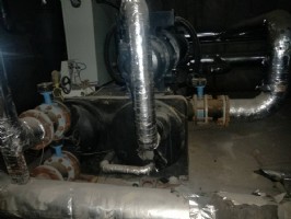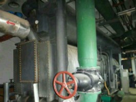 水蒸氣進入冷凝器,被冷凝器內的冷卻水降溫后凝結,成為高壓低溫的液態(tài)水;當冷凝器內的水通過節(jié)流閥進入蒸發(fā)器時,急速膨脹而汽化,并在汽化過程中大量吸收蒸發(fā)器內冷媒水的熱量,從而達到降溫制冷的目的;在此過程中,低溫水蒸氣進入吸收器,被吸收器內的溴化鋰水溶液吸收,溶液濃度逐步降低,再由循環(huán)泵送回發(fā)生器,完成整個循環(huán)。如此循環(huán)不息,連續(xù)制取冷量。