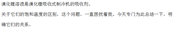 水是溴化鋰吸收式制冷機(jī)的冷媒。所以要經(jīng)常用到水的飽和溫度,如冷凝器中的冷凝溫度或蒸發(fā)器中的蒸發(fā)溫度。