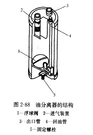 雎縮機(jī)的潤滑是靠從曲軸箱或其他油容器循環(huán)流動(dòng)的潤滑油來實(shí)現(xiàn)的。當(dāng)系統(tǒng)運(yùn)行時(shí),潤滑油與制冷劑混合而成的高壓蒸氣由壓縮機(jī)進(jìn)入排氣管。如果僅有少。星潤滑油隨制冷劑在系統(tǒng)中循環(huán),并不會影響系統(tǒng)的性能。但是如果制冷劑中混有過多的潤滑油進(jìn)入系統(tǒng),將會降低蒸發(fā)器和冷凝器的換熱效率,同時(shí)影響系統(tǒng)中流量控制部件的正常工作。通過設(shè)置油分離器,可以減少系統(tǒng)中的油循環(huán)量。油分離器的結(jié)構(gòu)如圖2-88所示,當(dāng)制冷劑氣體被壓縮機(jī)排出時(shí),油隨著氣體進(jìn)入排氣管,通過進(jìn)氣裝置進(jìn)入油分離器,由于速度降低,使油與氣分離,制冷刺氣體通過出口管進(jìn)入冷凝器,而當(dāng)?shù)撞窟_(dá)到一定油位時(shí),浮球閥打開,油通過回油管進(jìn)入壓縮機(jī)。