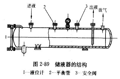 儲液器的結(jié)構(gòu)如圖2-89所示,其一般設(shè)置在冷凝器和節(jié)流元件之間,為使冷凝器中的液體制冷劑順利進(jìn)入儲液器,儲液器位置應(yīng)低于冷凝器300mm以上。對中小型制冷系統(tǒng),儲液器的容量應(yīng)能收容制冷裝置的全部充液量;對裝有多臺蒸發(fā)器的制冷系統(tǒng),儲液器的容量應(yīng)為最大容量蒸發(fā)器與儲液器中正常儲液量之和;為防止溫度發(fā)生變化時(shí)制冷劑的熱膨脹,儲液器中的最大收液量應(yīng)為其容器容積的80%。在能夠滿足使用的前提下,盡量選配容量較小的儲液器,這樣做既可減少裝置的體積和初投資,又可減少制冷劑的充注量。當(dāng)然,并不是所有制冷系統(tǒng)都必須安裝儲液器,如不裝儲液器系統(tǒng)仍可正常工作,則可不裝。
