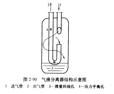 氣液分離器的結(jié)構(gòu)如圖2-90所示,位于U形管底部的微量回油孔將適量的冷凍潤滑油連同氣體一起返回壓縮機(jī)內(nèi),壓力平衡孔可防止壓縮機(jī)停機(jī)時(shí),氣液分離器內(nèi)的制冷劑液體通過微量回油孔流人壓縮機(jī)內(nèi),微量回油孔的大小由壓縮機(jī)的回液量確定。