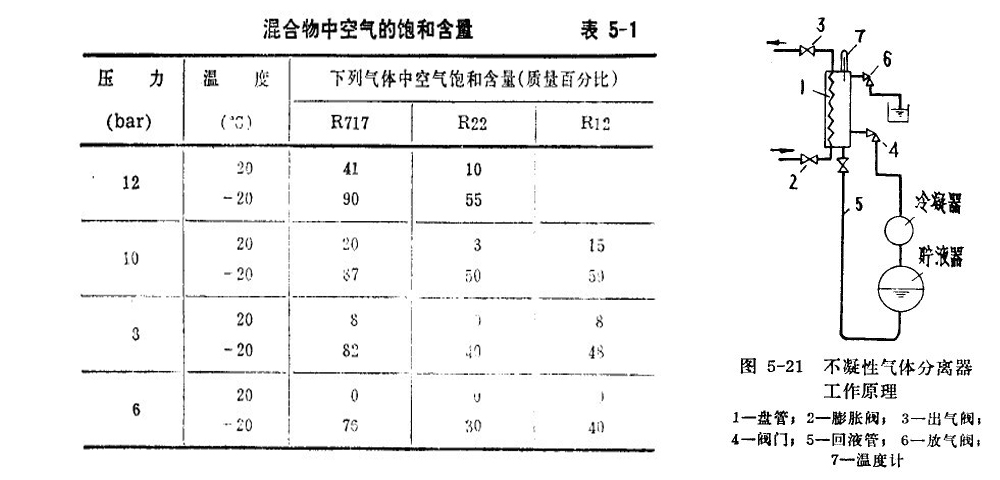 但是,如何既放出空氣而又能減少制冷劑的損失呢?這需要了解氣態(tài)制冷劑和空氣混合物中,空氣的飽和含量與壓力、溫度的關(guān)系。表5-1中給出了幾種氣態(tài)制冷劑中空氣飽和含量與壓力、溫度的關(guān)系,從表中可以看出,壓力越高,溫度越低,氣態(tài)制冷劑和空氣的混合物中空氣的質(zhì)量百分比越大。也就是說,在高壓低溫條件下放空氣時,損失的制冷荊最少。不凝性氣體分離器就是保證在高壓和低溫條件下放空氣的設(shè)備。