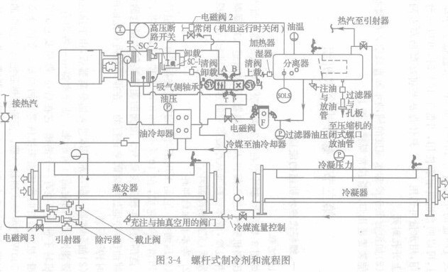 如圖3-4所示,制冷劑在蒸發(fā)器中吸收冷水的熱量而汽化,被螺桿壓縮機(jī)吸入,經(jīng)壓縮排入油分離器,分油后進(jìn)入冷凝器冷凝成液體并過冷,液體制冷劑從冷凝器中的過冷器出來,經(jīng)孔板節(jié)流進(jìn)入蒸發(fā)器,完成制冷循環(huán)。