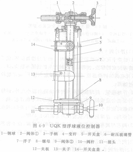 UQK型浮球液位控制器如圖4-9所示。它可以實現(xiàn)遠(yuǎn)距離控制液位及就地顯示液位。UQK-41型為短浮球.,用于油氨并存容器中的油位控制與放油。UQK-42型亦為短浮球,用于冷凍機的油位控制。UQK4-3型為長浮球,用于氨中間冷卻器、臥式貯液器的液位指示控制。