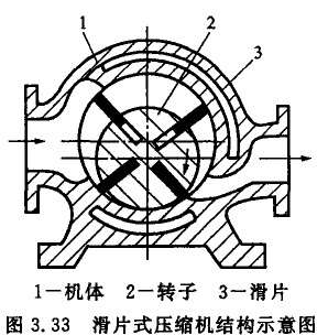 滑片式壓縮機(jī)的橫剖面示意圖如圖3.33所示。它主要由機(jī)體、轉(zhuǎn)子及滑片等三部分組成。