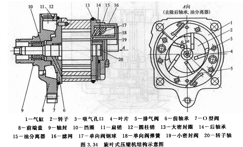 圖3.34所示是用于汽車空調(diào)器中的旋葉式壓縮機(jī)結(jié)構(gòu)圖。主要部件有氣缸、轉(zhuǎn)子、葉片和前后靖蓋(或稱前后軸承座)。隨著轉(zhuǎn)子的旋轉(zhuǎn),每個(gè)基元容積完成吸氣、壓縮和排氣過(guò)程,轉(zhuǎn)子旋轉(zhuǎn)一周,基元容積完成兩次吸氣、壓縮和排氣過(guò)程,圖中轉(zhuǎn)子旋轉(zhuǎn)一周可以實(shí)現(xiàn)十次吸、捧氣及壓縮過(guò)程。