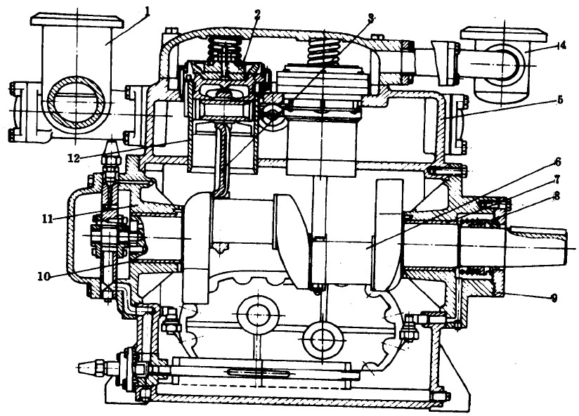壓縮機(jī)采用壓力潤滑,由軸后端轉(zhuǎn)子式油泵供油。潤滑油從曲軸箱底部經(jīng)濾油器進(jìn)入油泵,加壓后從曲軸兩端進(jìn)入潤滑油道。