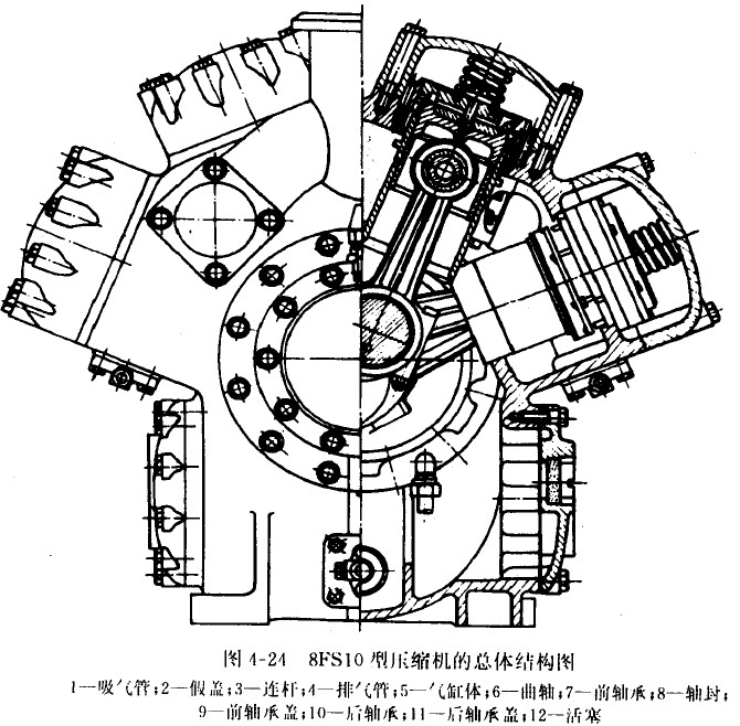 8FSlO型壓縮機(jī)的結(jié)構(gòu)如圖4-24所示。它的缸徑為100mm,行程70mm.轉(zhuǎn)速1440r/min.當(dāng)用R12時,其標(biāo)準(zhǔn)制冷量為97.7kW,用R22時的標(biāo)準(zhǔn)制冷域為156.3kW,是屬于中型壓縮機(jī)。
