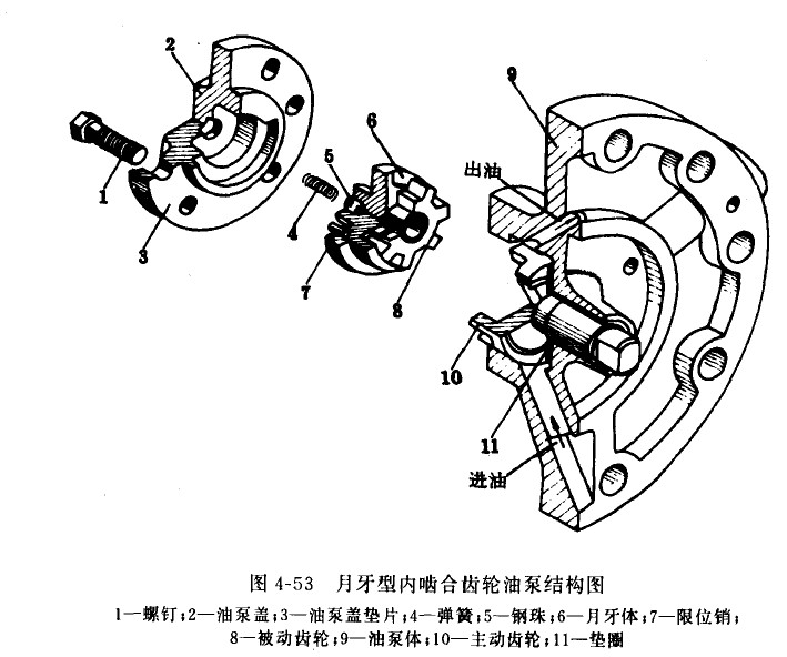 這種油泵的特點是不論順轉、反轉,都能按原定流向供油。圖4-53是這類油泵的結構圖。油泵由內齒輪(主動)、外齒輪(從動)、月牙體、油泵體、油泵盞等組成。內、外齒輪相偏心嚙合,它們和月牙體、油泵體、油泵蓋的徑向間隙和端面間隙是很小的,因此,它們之間就形成了許多貯油空間。當內齒輪在曲軸帶動下旋轉時,外齒輪和這些貯油空間亦隨之旋轉。從圖4-54可知,這些貯油空間在兩齒嚙合處是最小,當轉向吸油腔一邊時,容積逐漸擴大,于是,潤滑油不斷被吸入填充,當轉到排油腔一邊時,容積卻由大變小,迫使其中潤滑油不斷從排油腔排出。所以,兩齒嚙合處和月牙體是吸、排油腔之間的密封壁面。