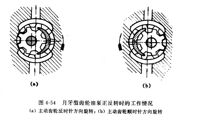 由圖4-54可見,在月牙體的背面有一定位銷卡在泵蓋的半圓槽內。內齒輪反時針方向轉動時,月牙體被定位銷定在內齒輪中心的右方,外齒輪的中心在左方(見圖(a)),若曲軸反轉,使內齒輪順時針方向轉動時,月牙體就跟著順時針轉過180。并被定位銷定在內齒輪中心的左方,外齒輪的中心則改在右方(見圖(b))。由于月牙體能隨油泵的轉向改變而移位,結果使吸油腔一邊的貯油空間始終是由小變大,而排油泵一邊始終是由大變小,所以油泵的供油方向不會因轉向的改變而有所影響。