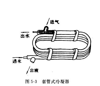 圖5-3是氟利昂套管式冷凝器,它是由兩種直徑不同的無(wú)縫鋼管和紫銅管套在一起,盤成長(zhǎng)圓形或圓形的一種冷凝器。氟利昂蒸氣在套管空間內(nèi)冷凝,冷凝液從下面流出。冷卻水在內(nèi)管中自下而上流動(dòng),與氟利昂蒸氣的流向相反。冷卻水流速在1-2m/s之間。