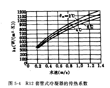 由于水在管內(nèi)流程較長(zhǎng),因而進(jìn)出口溫差較大,約在8-10℃之間。圖5-4是R12套管式冷凝器中冷凝時(shí)的傳熱系數(shù)。圖中口。是對(duì)數(shù)傳熱溫差。