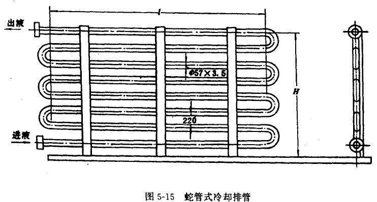 蛇管式冷卻排管可分為光管和翅片管兩種。光管式常采用+57mm×3.5mm或+38mm×3.0mm的無縫鋼管或+16mm×1.Omm的紫銅管制成。翅片管式常用繞片管制成。這種排管如圖5-15所示。它可用氨或氟利昂作為制冷荊,它的優(yōu)點(diǎn)是存液量少,僅為其排管內(nèi)容積的40%左右。它的主要缺點(diǎn)是制冷劑的流動阻力較大。