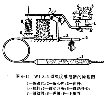 WJ-3.5型溫度繼電器的工作原理,如圖6-14所示。由感溫包l、毛細(xì)管9、波紋管7所組成的感溫機(jī)構(gòu),對(duì)杠桿4產(chǎn)生一個(gè)頂力,此頂力矩與彈簧產(chǎn)生的拉力矩相平衡,若被測(cè)介質(zhì)的溫度低于調(diào)定值時(shí),由于頂力矩小于拉力矩而使杠桿以O(shè)為支點(diǎn)逆時(shí)針?lè)较蜣D(zhuǎn)動(dòng),杠桿將微動(dòng)開(kāi)關(guān)接下,可以切斷電源,停止電磁閥供液,反之,當(dāng)被測(cè)介質(zhì)溫度上升,則動(dòng)作過(guò)程相反,使微動(dòng)開(kāi)關(guān)復(fù)位,使電磁閥電路導(dǎo)通,電磁閥開(kāi)通供液。