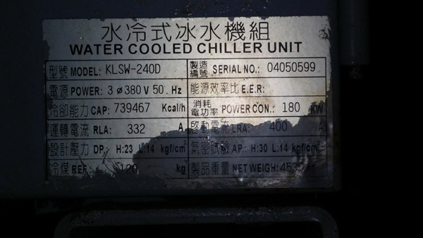 堃霖水冷式冰水機(jī)組,型號(hào):KLSW-240D 制冷量:74萬大卡 功率:180KW 啟動(dòng)電流: 400A 重量:4530KG 生產(chǎn)日期:2003年 臺(tái)灣原裝進(jìn)口。