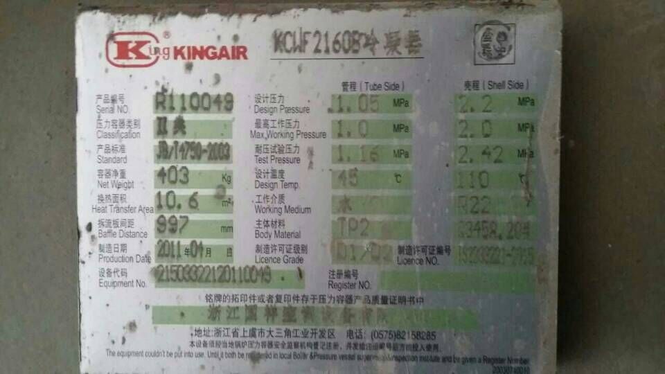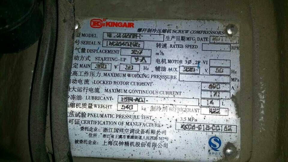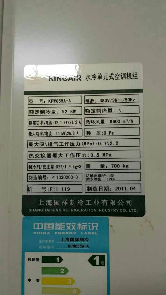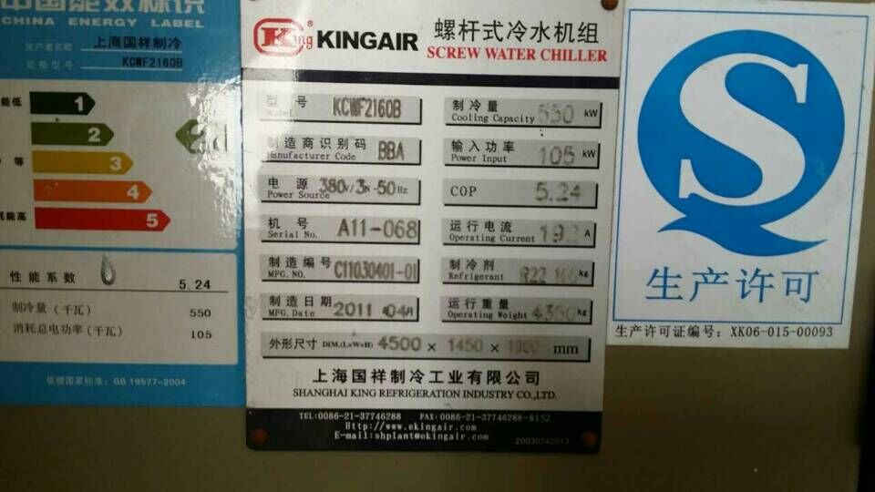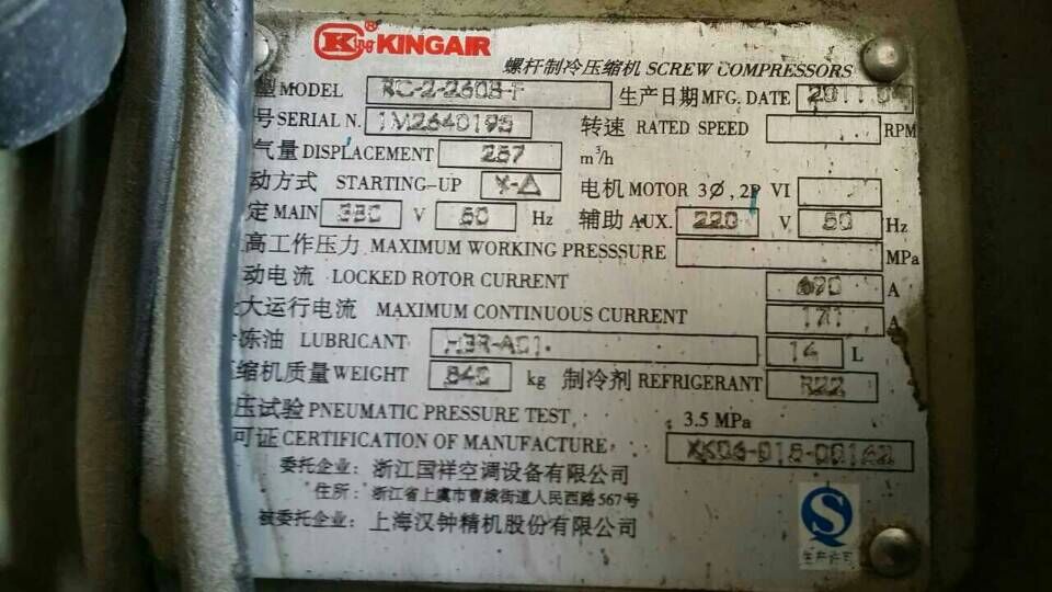 處理:國(guó)祥雙螺桿冷水機(jī)組一套:包括:主機(jī)一套,型號(hào):KCWF2160B 制冷劑:R22 生產(chǎn)日期:2011 重量:4350