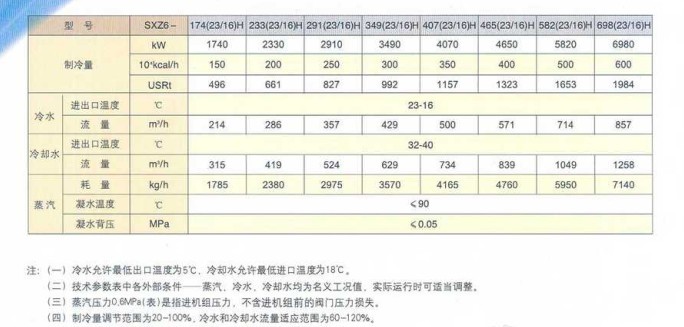 雙良溴化鋰制冷機(jī)(焦化行業(yè)):型號(hào)、制冷量(1470-6980KW)、冷水進(jìn)出口溫度(23-16℃)、冷水流量(214-817m3/h)、蒸汽耗量等(1785-7140kg/h)。