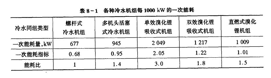 目前各公司的產(chǎn)品性能差異甚大,為此采用同一大型中外合資企業(yè)的冷水機組進行比較。冷水機組的運行條件為:冷凍水溫度7/12C;冷卻水進水溫度32℃。分別計算出各種冷水機組的一次能耗量(熱制冷機組包括消耗的電能)、一次能耗指標(即每1kW制冷量所消耗的一次能)及能耗比,計算結(jié)果列于表8-1中。不難看到,在上述條件下,吸收式制冷的能耗總體上高于蒸氣壓縮式制冷。但是,如果吸收式制冷機所耗的熱量由熱電站供應(yīng),則應(yīng)考慮到熱電站供熱是利用了發(fā)電時本應(yīng)排到大氣中的熱量,同時還應(yīng)考慮到由此影響了電能生產(chǎn)的效率,也就是說,應(yīng)對熱、電、冷聯(lián)產(chǎn)系統(tǒng)進行綜合評價。分析結(jié)果表明,在一定條件下,熱、電、冷聯(lián)產(chǎn)與分產(chǎn)相比是節(jié)能的。