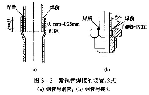 相同直徑紫銅管的對焊,應(yīng)采用插入焊的結(jié)構(gòu)形式,見圖3-3。紫銅管的一端用鋼沖模沖成擴口,將接頭部分內(nèi)外表面用砂布擦亮,并插入擴口內(nèi)緊壓,以免焊接時焊料從間隙流進管內(nèi),焊接時最好將管子垂直安放。同管徑對接時,不宜采用如圖3-4所示的焊接方式,因紫銅管管壁薄,難以保證焊接質(zhì)量。