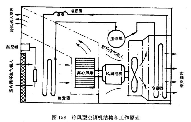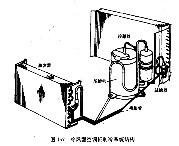 冷風(fēng)型空調(diào)機(jī)制冷系統(tǒng)主要由壓縮機(jī)、冷凝器、過(guò)濾器、毛細(xì)管、蒸發(fā)器等組成(圖157)。工作過(guò)程是,壓縮機(jī)吸入來(lái)自蒸發(fā)器的低溫、低壓制冷劑蒸氣,經(jīng)過(guò)壓縮轉(zhuǎn)變?yōu)楦邷?、高壓的制冷劑蒸氣送入冷凝器,高溫高壓的制冷劑蒸氣在冷凝器中向空間散發(fā)熱量(由風(fēng)扇強(qiáng)行空氣對(duì)流冷卻),使制冷劑液化,液化后的制冷劑經(jīng)過(guò)濾器過(guò)濾和毛細(xì)管節(jié)流降壓后進(jìn)入蒸發(fā)器,制冷劑液體在蒸發(fā)器中沸騰汽化,吸收周圍的熱量(由離心風(fēng)扇將蒸發(fā)器周圍的冷氣輸送到室內(nèi),室內(nèi)的熱空氣由離心風(fēng)扇吸入蒸發(fā)器,冷卻循環(huán)),在蒸發(fā)器中吸熱汽化后的制冷劑蒸氣又吸入壓縮機(jī)進(jìn)行制冷循環(huán)(圖158)。