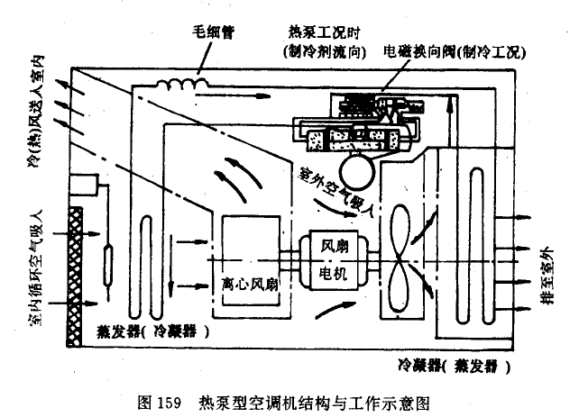 熱泵冷風(fēng)型空調(diào)機(jī)既可以在夏季降溫使用,又可以在冬季取暖使用。它是在冷風(fēng)型的基礎(chǔ)上增加了一個(gè)電磁換向四通閥。熱泵是將低溫?zé)嵩?、室外空氣中的熱量吸收并轉(zhuǎn)移卦高溫?zé)嵩词覂?nèi)空氣中去,達(dá)到制熱目的(圖159)。熱泵通過(guò)電磁換向閥轉(zhuǎn)換,使從