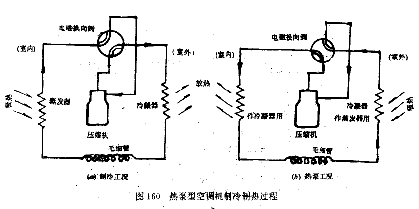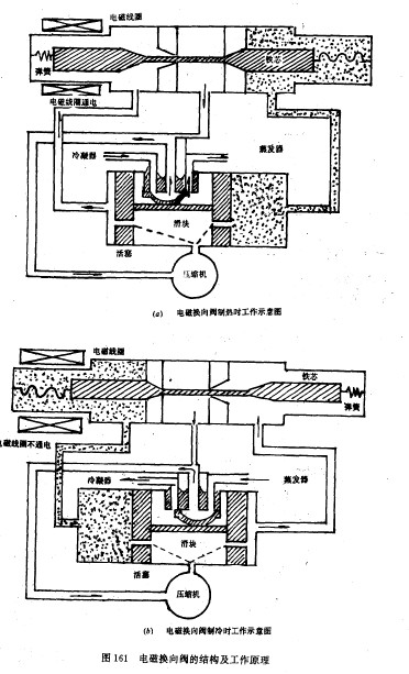 壓縮機(jī)而來(lái)的高溫高壓制冷劑蒸氣進(jìn)入室內(nèi)機(jī)組(蒸發(fā)器)向室內(nèi)空間散熱,經(jīng)散熱冷卻后的制冷劑又經(jīng)毛細(xì)管流入室外機(jī)組(冷凝器)中沸騰吸收室外低溫空氣中的熱量,沸騰汽化后的制冷劑又被壓縮機(jī)吸氣進(jìn)行循環(huán)。其制冷、制熱原理見(jiàn)圖160。電磁換向閥的結(jié)構(gòu)及工作原理見(jiàn).161。