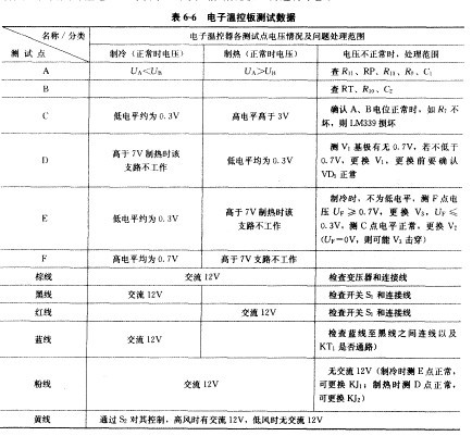 在實際維修中,應(yīng)用最多的是關(guān)鍵點檢查法。如圖3-44中,A、B、C、D、E、F各點及各色導(dǎo)線連接點均為主要測試點,各點正常測試數(shù)據(jù)見表6-6。對照印制電路板中的上述各點,檢測其對應(yīng)電壓,與表中正常測試數(shù)據(jù)比較,再進行維修。