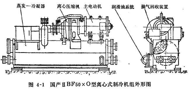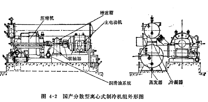 增速裝置外裝式,是指機組中的增速箱與壓縮機、主電動機各自分開,其間采用聯(lián)軸器連接。這種型式見于早期的分散型空調(diào)用離心式制冷機組中,如圖4-2所示外形圖。